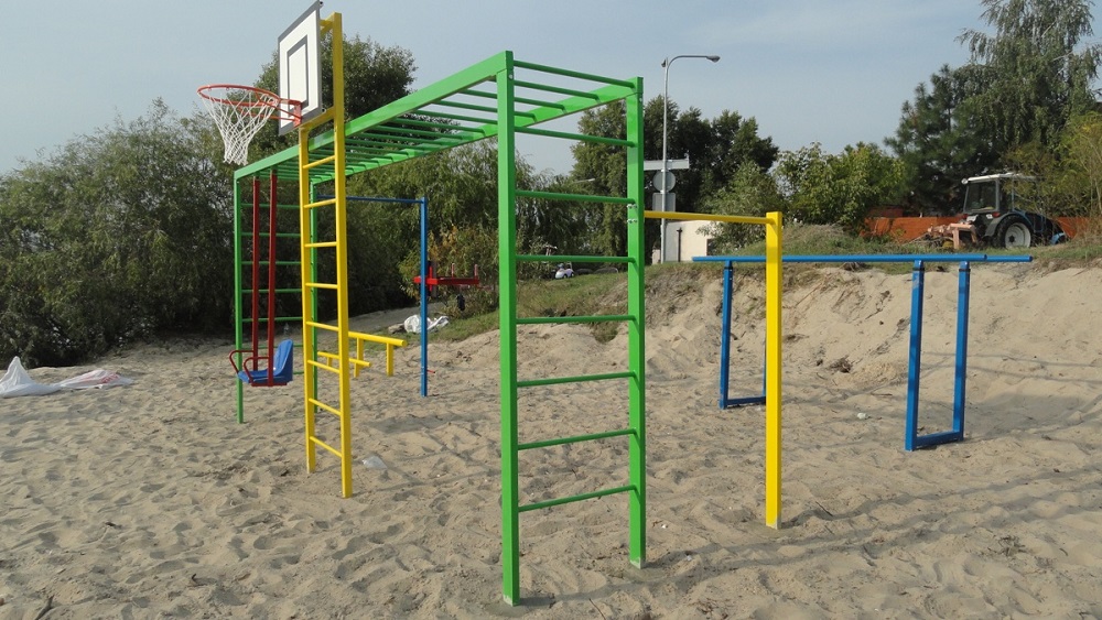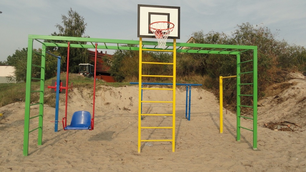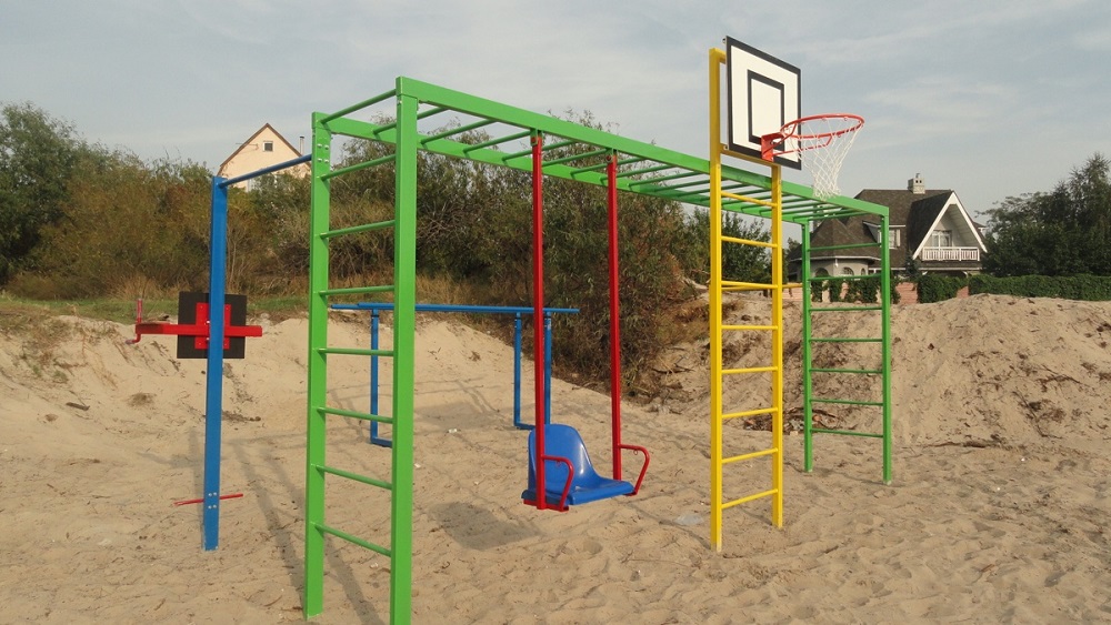 Детский спортивный комплекс - цельная металлическая конструкция, состоящая из: рукохода, шведской стенки, двухуровневого турника, баскетбольного щита и качели.