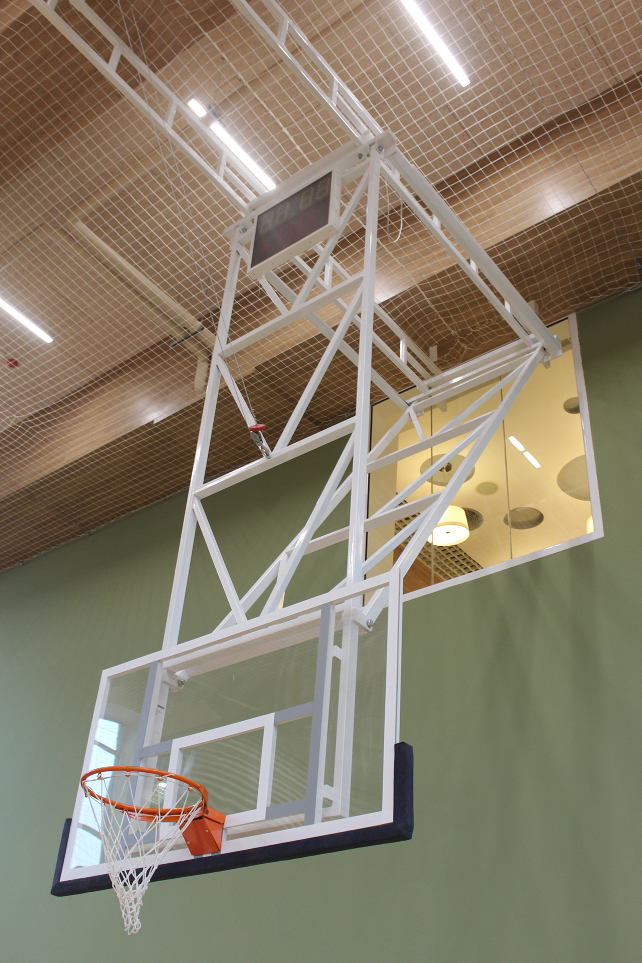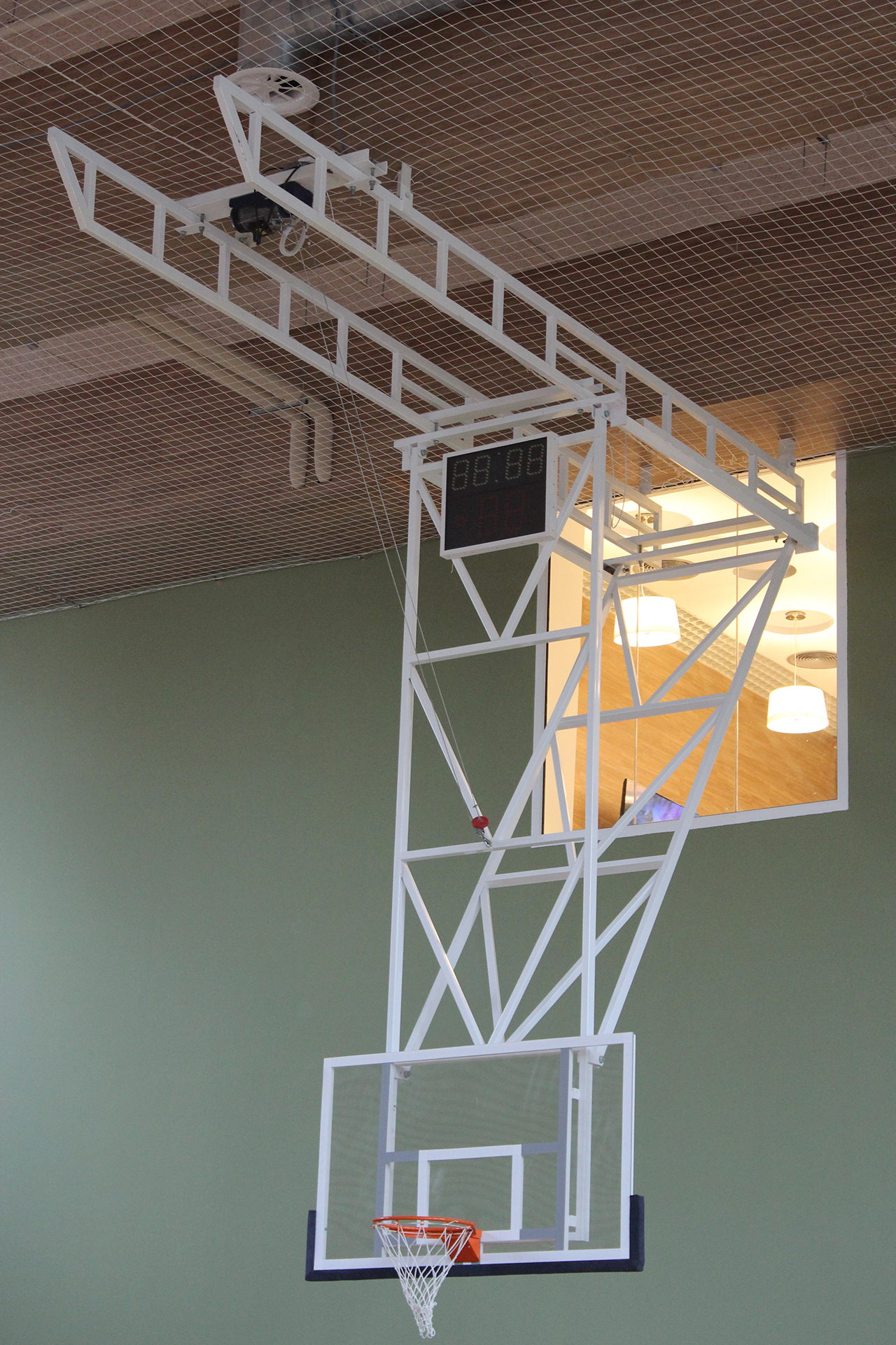 Известная практика, в учебных заведениях, совмещать зал для игры в футбол, баскетбол, волейбол, теннис и прочие виды спорта. Но есть одна проблема - не хватка пространства для маневров. И эту проблему можно решить, поставив ферму крепления баскетбольную вертикально-подъемную к потолку. Сложив ферму вдоль потолка, они не будут мешать тренировкам других спортивных направлений.