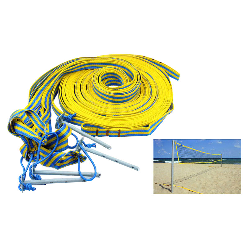 Разметка площадки пляжного волейбола Транзит Ur SO-5277. Размер: 8х16 м. Ширина ленты: 2,5 см. Крепление: 4 колышка для крепления ленты к грунту. Цвет: желтый-синий.
