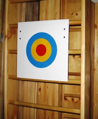 Щит для метания мяча в цель изготовлен из хвойных или лиственных твердых пород древесины. Окрашен эмалью светлых тонов.Мишень для метания навесная на стенку гимнастическую с крюками 500мм х 500мм