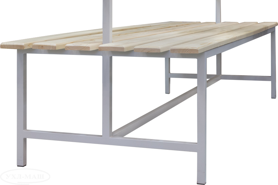 Скамейка двусторонняя со спинкой и вешалкой с крючками для раздевалок - удобная и практичная вещь при переодевании для тренировок в спортивном зале, бассейне, холле, да в принципе где угодно, а так же отдыха. На верхней панели скамьи имеются крючки для вещей, что значительно экономит место на скамейке.