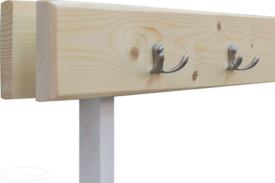 Скамейка двусторонняя со спинкой и вешалкой с крючками для раздевалок - удобная и практичная вещь при переодевании для тренировок в спортивном зале, бассейне, холле, да в принципе где угодно, а так же отдыха. На верхней панели скамьи имеются крючки для вещей, что значительно экономит место на скамейке.