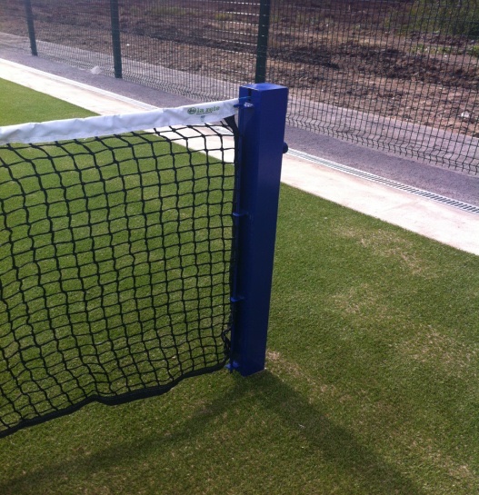 Стойки вставляются в закладные, которые бетонируются в землю. Теннисная сетка к стойкам крепятся с помощью стального прута.