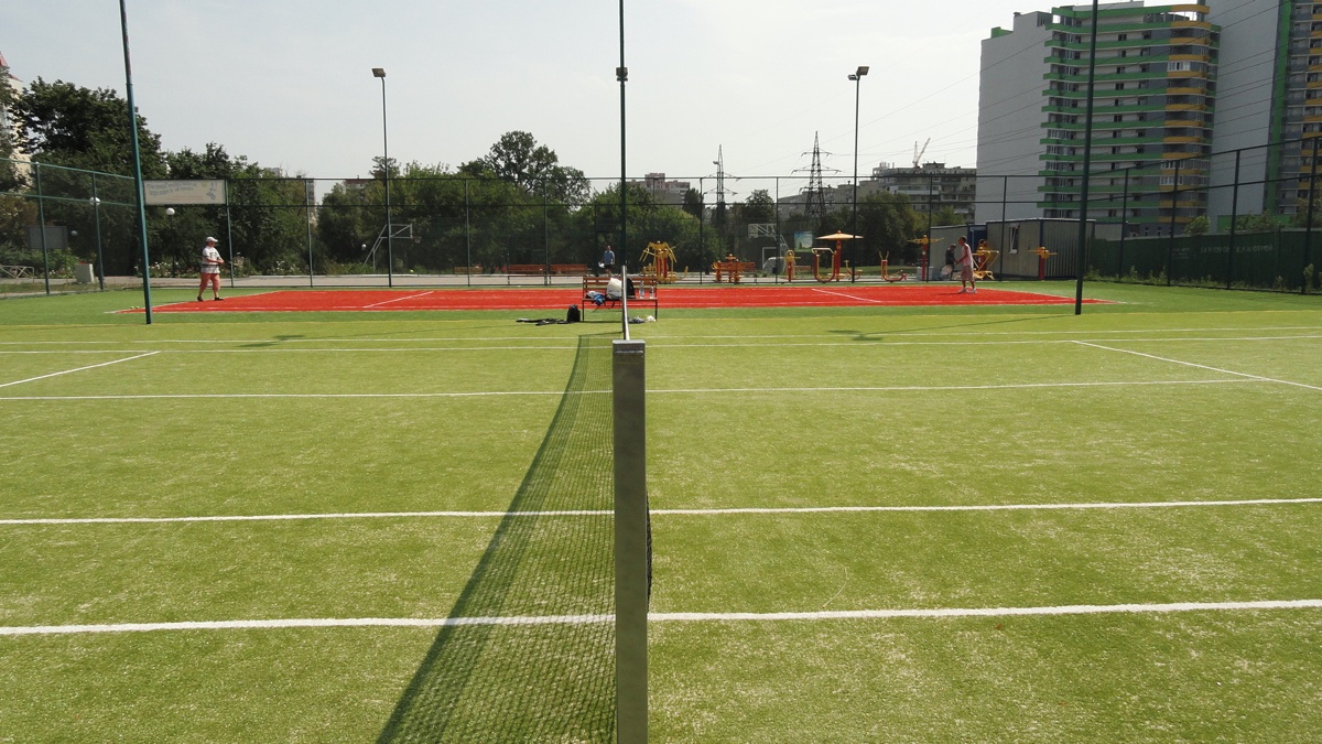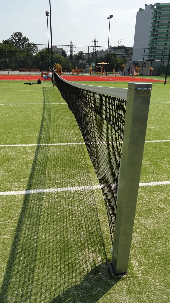 Стойки вставляются в закладные, которые бетонируются в землю. Теннисная сетка к стойкам крепятся с помощью крючков.