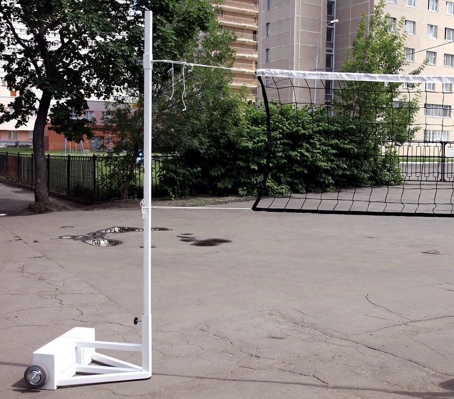 Стойки для волейбола мобильные на крючках для противовесах, передвижные на колесах.