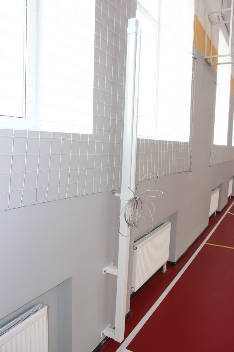 Для крепления сетки предусмотрены специальные крючки. Сетка крепится с помощью крючков к траверсам стоек и держится за трос, протянутый между стойками.