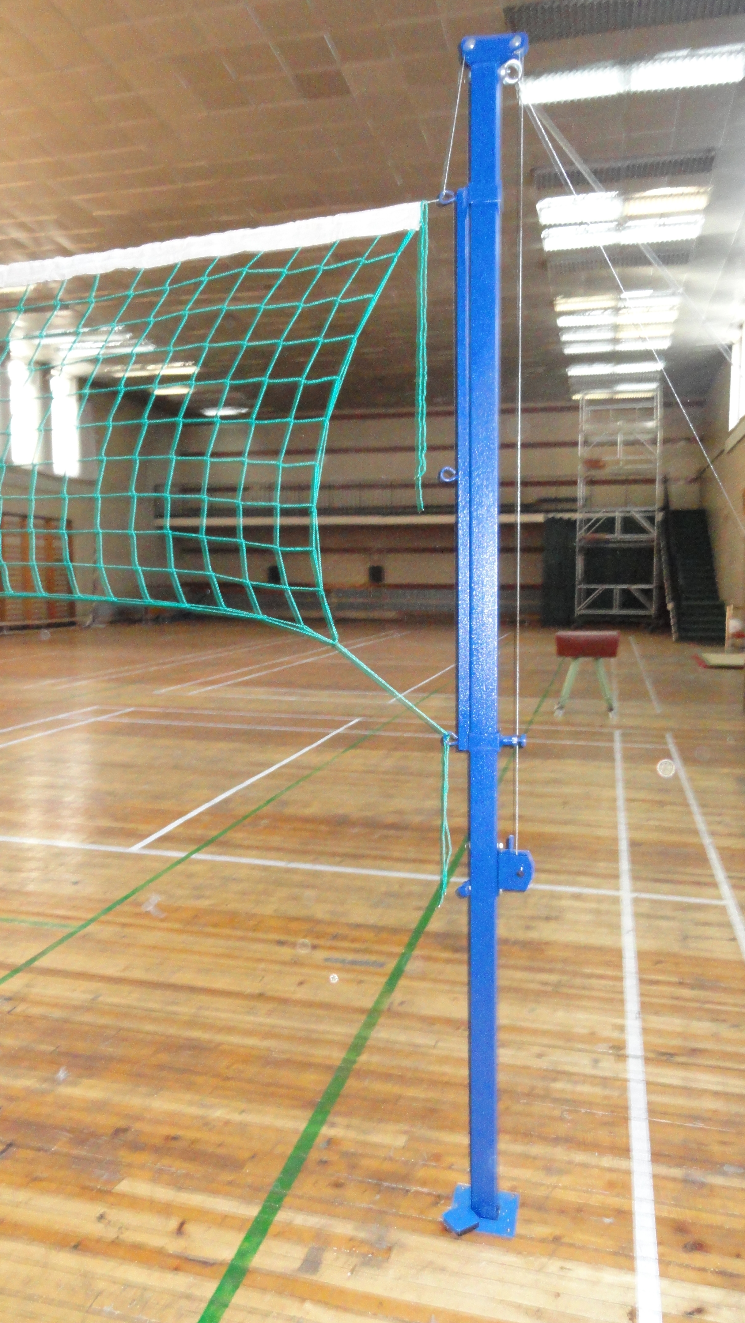 Стойки вставляются в закладные, которые бетонируются в землю. Для крепления бадминтонной и волейбольной сеток предусмотрены специальные крючки.
