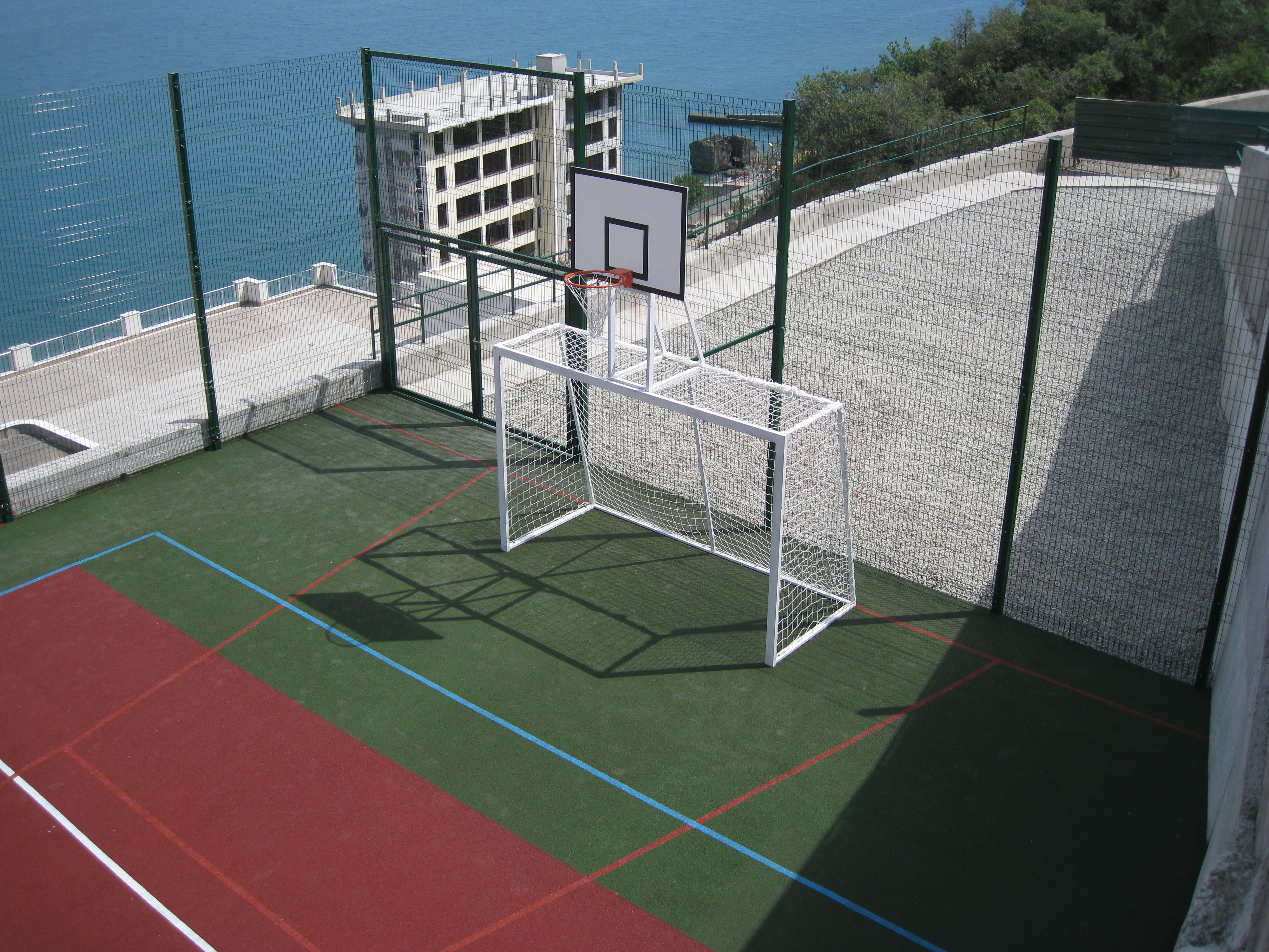 Баскетбольный щит изготовлен из влагостойкой ламинированной водостойкой фанеры с металлической рамой и оснащен простой корзиной. Преимущества данного покрытия: